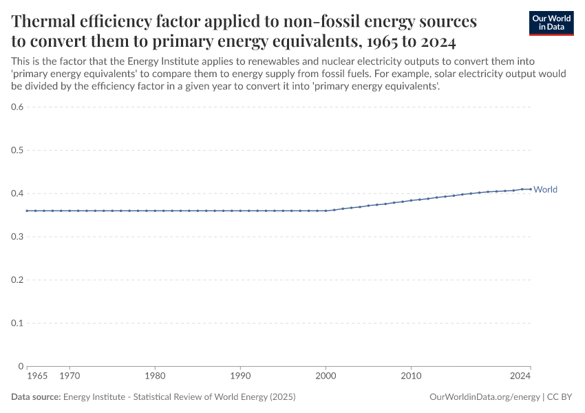 Energy Institute - Statistical Review of World Energy (2025) – with major processing by Our World in Data. “Thermal equivalent efficiency factors” [dataset]. Energy Institute, “Statistical Review of World Energy” [original data]. Retrieved January 6, 2026 from https://select-date-by-typing.owid.pages.dev/grapher/thermal-efficiency-factor