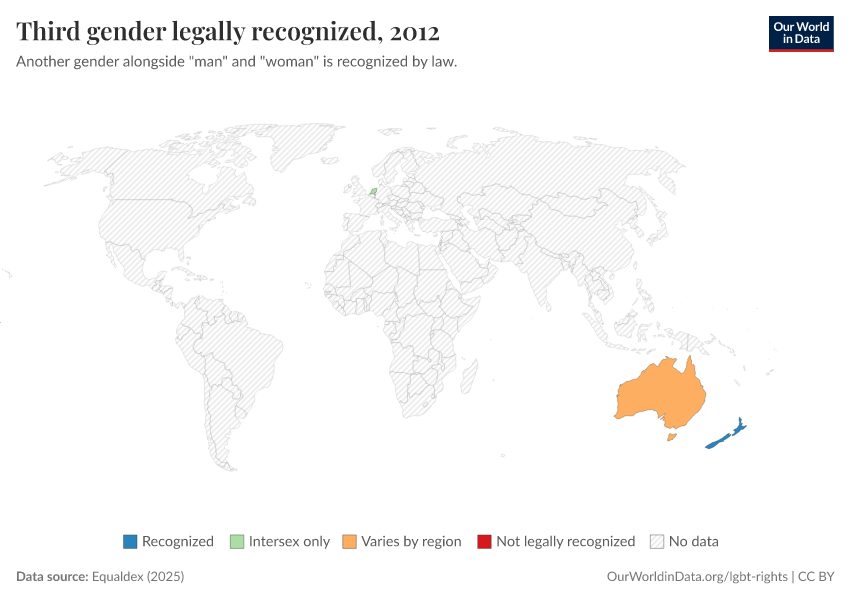 “Data Page: Third gender legally recognized”, part of the following publication: Bastian Herre and Pablo Arriagada (2023) - “LGBT+ Rights”. Data adapted from Equaldex. Retrieved from https://select-date-by-typing.owid.pages.dev/grapher/third-gender-recognition-equaldex [online resource]How to cite this data