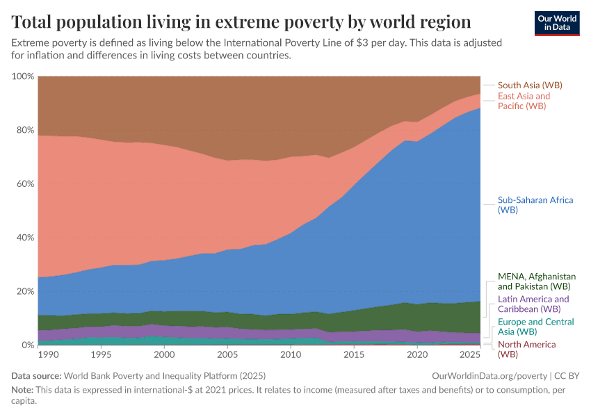 World Bank Poverty and Inequality Platform (2025) – with major processing by Our World in Data. “Total population living in extreme poverty by world region – World Bank” [dataset]. World Bank Poverty and Inequality Platform, “World Bank Poverty and Inequality Platform (PIP) 20250930_2021, 20250930_2017” [original data]. Retrieved January 6, 2026 from https://select-date-by-typing.owid.pages.dev/grapher/total-population-living-in-extreme-poverty-by-world-region