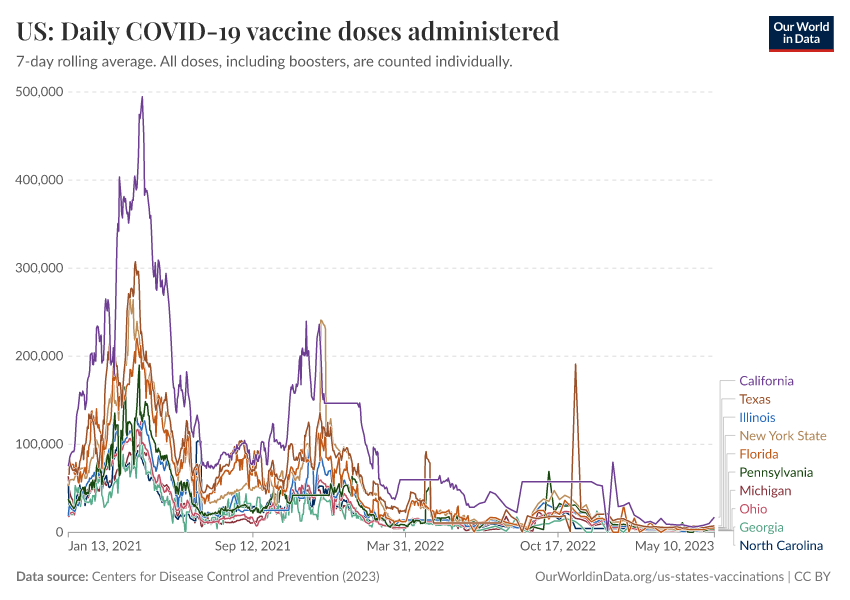 Centers for Disease Control and Prevention (2023) – processed by Our World in Data. “US: Daily COVID-19 vaccine doses administered” [dataset]. Centers for Disease Control and Prevention, “COVID-19, Vaccinations (United States)” [original data]. Retrieved January 6, 2026 from https://select-date-by-typing.owid.pages.dev/grapher/us-daily-covid-vaccine-doses-administered