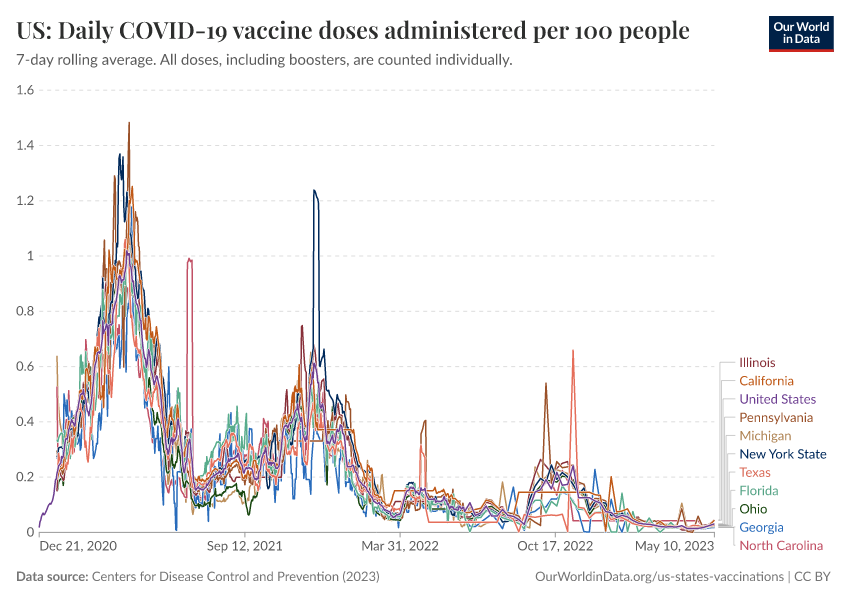 Centers for Disease Control and Prevention (2023) – processed by Our World in Data. “US: Daily COVID-19 vaccine doses administered per 100 people” [dataset]. Centers for Disease Control and Prevention, “COVID-19, Vaccinations (United States)” [original data]. Retrieved January 6, 2026 from https://select-date-by-typing.owid.pages.dev/grapher/us-daily-covid-vaccine-doses-per-100