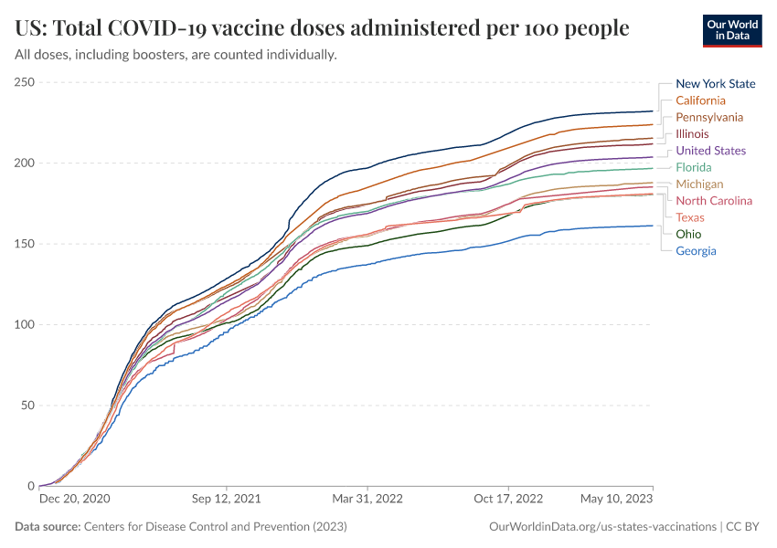 Centers for Disease Control and Prevention (2023) – processed by Our World in Data. “US: Total COVID-19 vaccine doses administered per 100 people” [dataset]. Centers for Disease Control and Prevention, “COVID-19, Vaccinations (United States)” [original data]. Retrieved January 6, 2026 from https://select-date-by-typing.owid.pages.dev/grapher/us-state-covid-vaccines-per-100