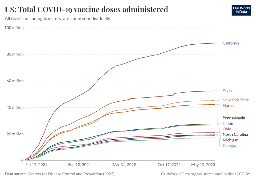 Centers for Disease Control and Prevention (2023) – processed by Our World in Data. “US: Total COVID-19 vaccine doses administered” [dataset]. Centers for Disease Control and Prevention, “COVID-19, Vaccinations (United States)” [original data]. Retrieved January 6, 2026 from https://select-date-by-typing.owid.pages.dev/grapher/us-total-covid-19-vaccine-doses-administered