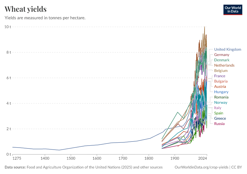 Food and Agriculture Organization of the United Nations (2025); Broadberry et al. (2015); Brassley (2000); Bayliss-Smith & Wanmali (1984) – with major processing by Our World in Data. “Wheat yields” [dataset]. Food and Agriculture Organization of the United Nations, “Production: Crops and livestock products”; Broadberry et al., “Long-term crop yields in UK”; Brassley, “Long-term crop yields in UK”; Bayliss-Smith & Wanmali, “Understanding Green Revolutions” [original data]. Retrieved January 6, 2026 from https://select-date-by-typing.owid.pages.dev/grapher/wheat-yields