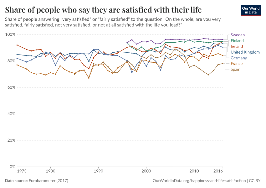The Eurobarometer survey collects data on life satisfaction as part of their public opinion surveys. For several countries, these surveys have been conducted at least annually for more than 40 years. The visualization here shows the share of people who report being ‘very satisfied’ or ‘fairly satisfied’ with their standards of living.