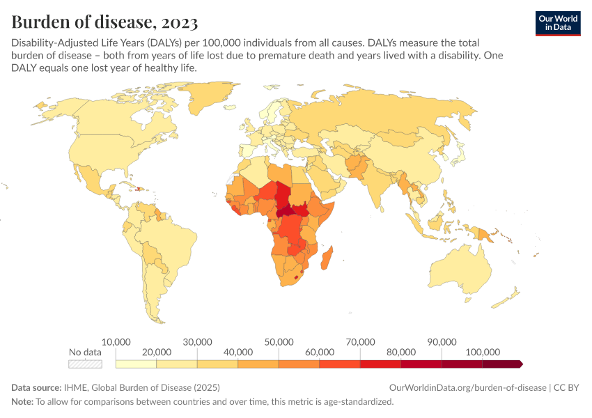 This map shows DALYs per 100,000 people in the population. It is thereby measuring the distribution of the burden of both mortality and morbidity around the world.
