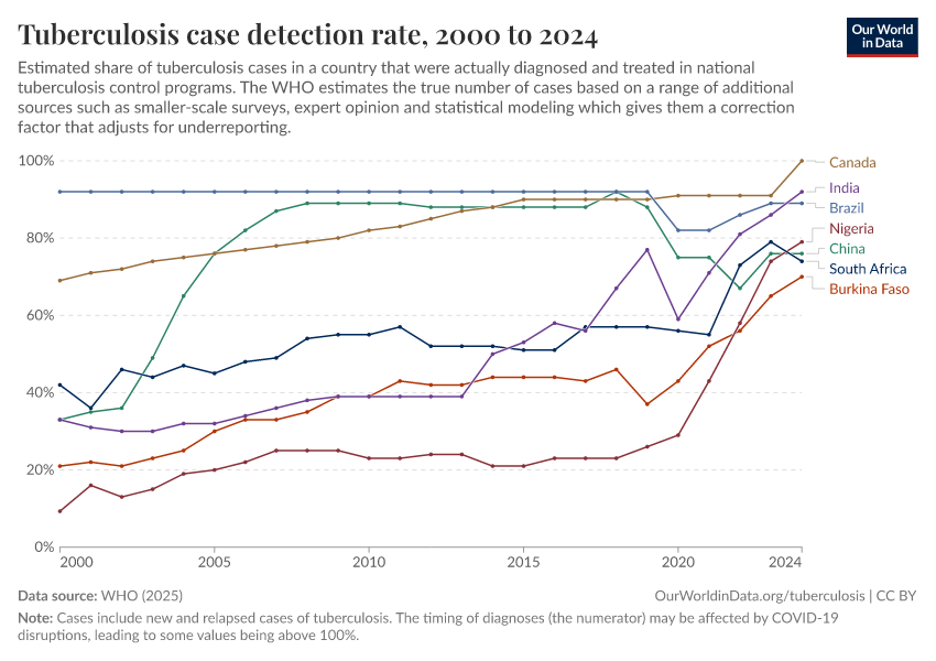 In the chart below, you can see rises in detection rates for tuberculosis in different countries. This is again helped by efforts such as The Global Fund and PEPFAR.