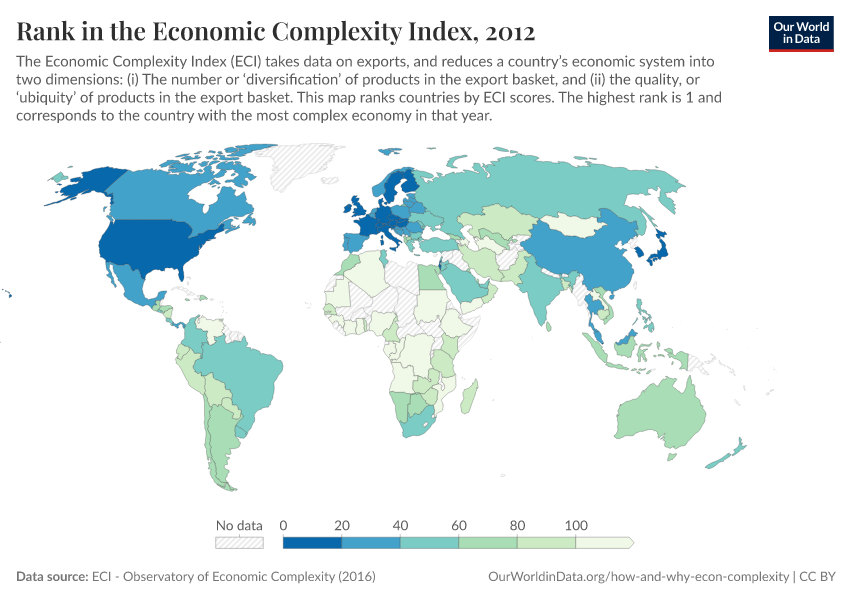 Loosely speaking, the least complex countries, at the bottom of the ECI rank, are those that export very few different types of products (i.e. have export baskets that are not diversified) and those products that they do export are produced in many other countries (i.e. export baskets that load heavily on just a few ubiquitous products).