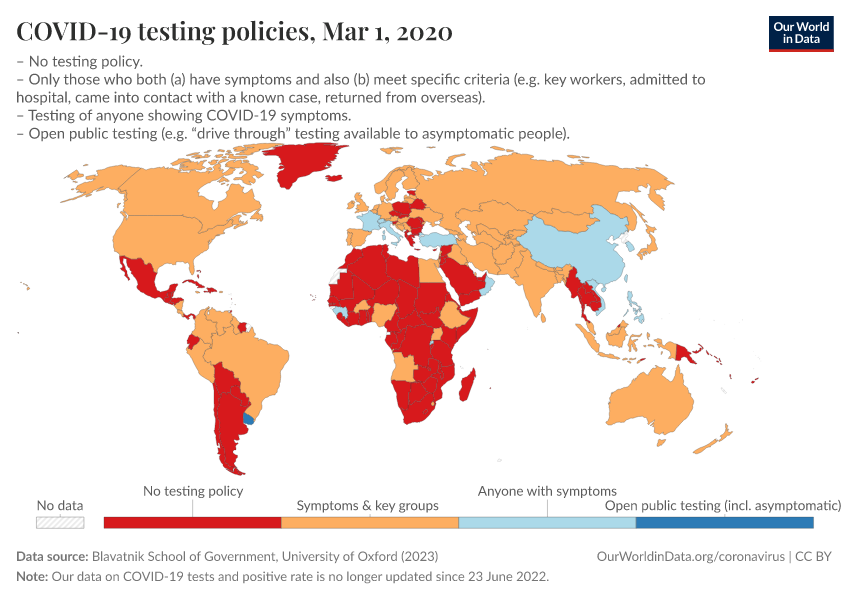 However, many countries conducted limited testing, as shown in the map below. It shows which population groups could be tested for COVID-19.