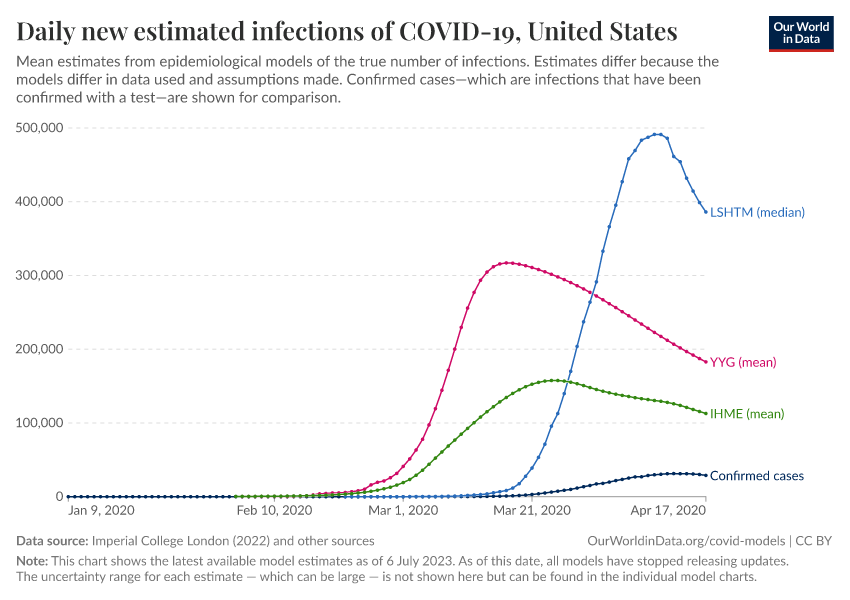 The chart below compares the number of confirmed cases to different estimates of the true number of infections.