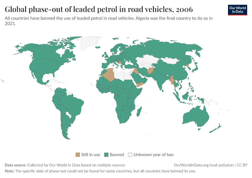 Hannah Ritchie (2022) - “How the world eliminated lead from gasoline” Published online at OurWorldinData.org. Retrieved from: 'https://select-date-by-typing.owid.pages.dev/leaded-gasoline-phase-out' [Online Resource]BibTeX citation