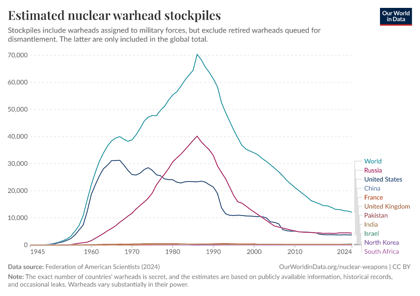 Bastian Herre, Pablo Rosado, and Max Roser (2024) - “Nuclear Weapons” Published online at OurWorldinData.org. Retrieved from: 'https://select-date-by-typing.owid.pages.dev/nuclear-weapons' [Online Resource]BibTeX citation