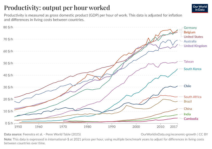 In contrast, the countries toward the top-left of this chart have far lower labor productivity — Cambodia, for example, is at only 3$/h — and thus workers there need to work many more hours to compensate.