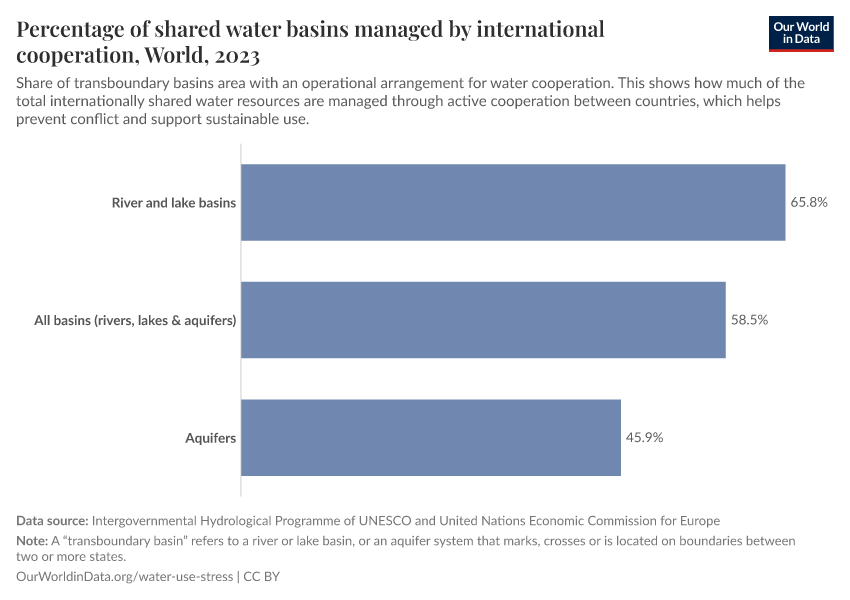 This indicator measures the share of the land area covered by transboundary basins (river or lake basins, or aquifer systems, that mark, cross, or are located on the boundaries of multiple countries) that are covered by operational cooperation agreements between countries.