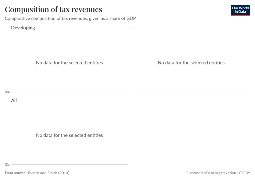 The visualization presents a breakdown of tax revenue sources, comparing figures from 1986 and 1996. The estimates are provided for a selection of country groups (you can switch country groups by clicking on the option 'change country group'), and are expressed as a share of GDP. The data comes from Todaro and Smith (2014)9, and includes direct taxes (corporate and income taxes), as well as indirect taxes (general, commodity, and excise taxes) and social security contributions.