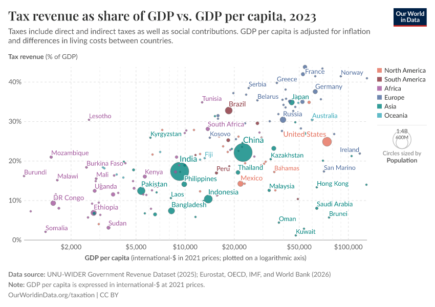 We have already pointed out that rich countries tend to collect much higher tax revenues than poor countries. The visualization provides further evidence of the extent of this correlation.