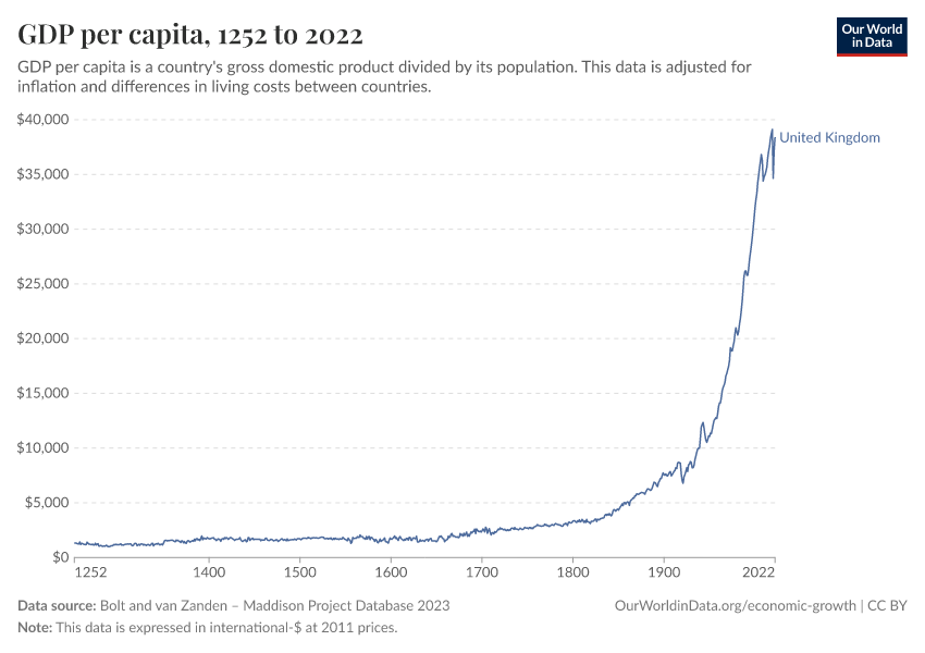 One of the very first countries to achieve sustained economic growth was the United Kingdom. In this chart, we see the reconstructions of GDP per capita in the UK over the last centuries.